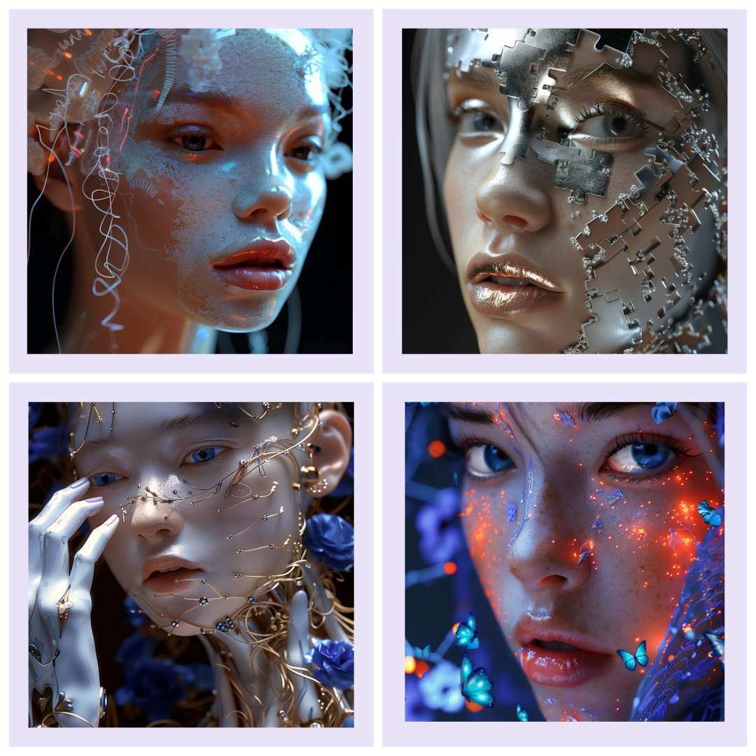 The first piece in the collection, titled "Woman with white porcelain makeup" (MP4)captures the delicate balance between human beauty and technological enhancement.