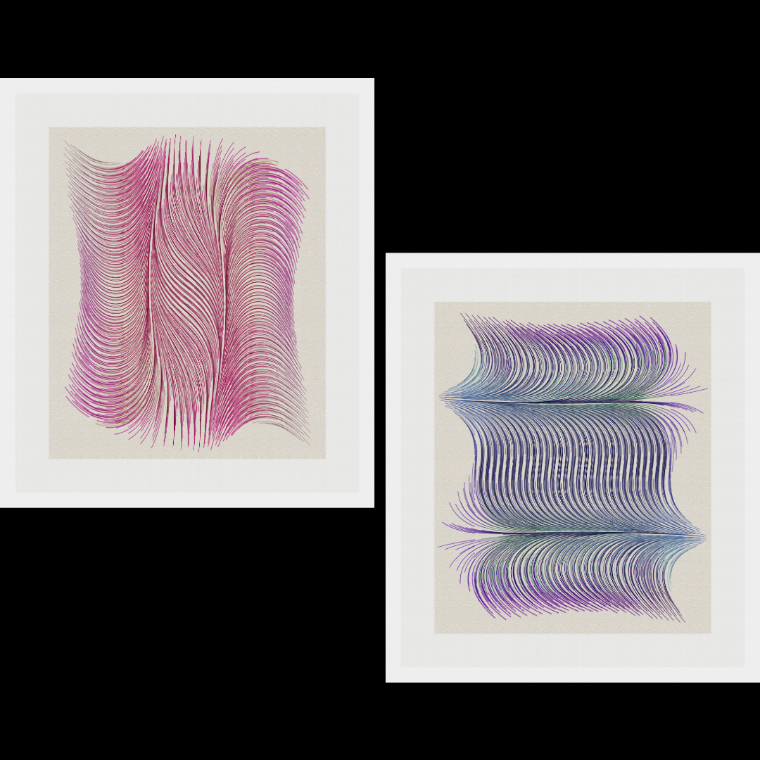 This series invites the viewer to experience the interplay of undulating waves and fluctuating patterns, evoking a sense of movement and balance within randomness. The soft colour palettes and continuous lines create a composition where noise is not disruptive but instead serves as the conductor of a tranquil and mesmerizing visual journey.